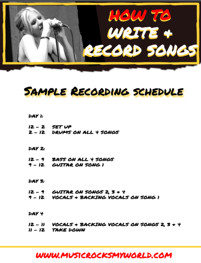 3. What do you have to do within this time – drums, guitar, bass, vocals? Do you have strings or keyboards or programming? Backing vocals? List it all out.